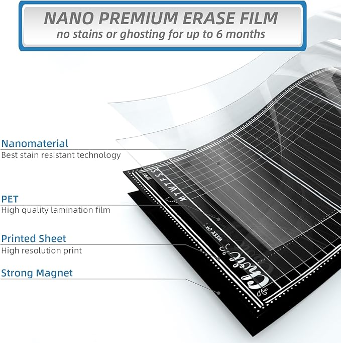 - WET ERASE - With nano premium erase film, it will be a breeze to wipe off the writings even after several months; it’s not going to leave any stains; it’s waterproof, so you can clean it with a wet cloth if you want.