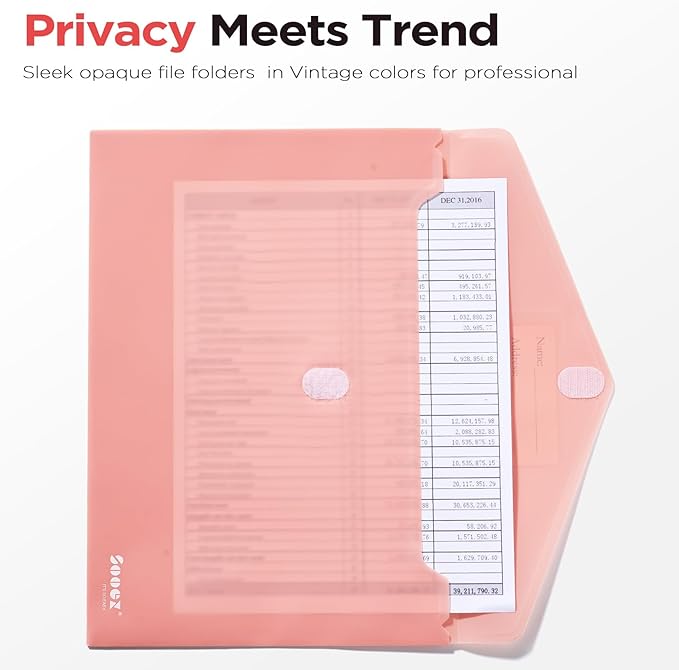 - Large Capacity and Outside Label Pocket: 13.2" x 9.2" file folders, easily holds more than 200 sheets. Fit for the paper size of US letter/A4 prints or smaller document storage. Classify and identify your documents easily with the outside label pocket.