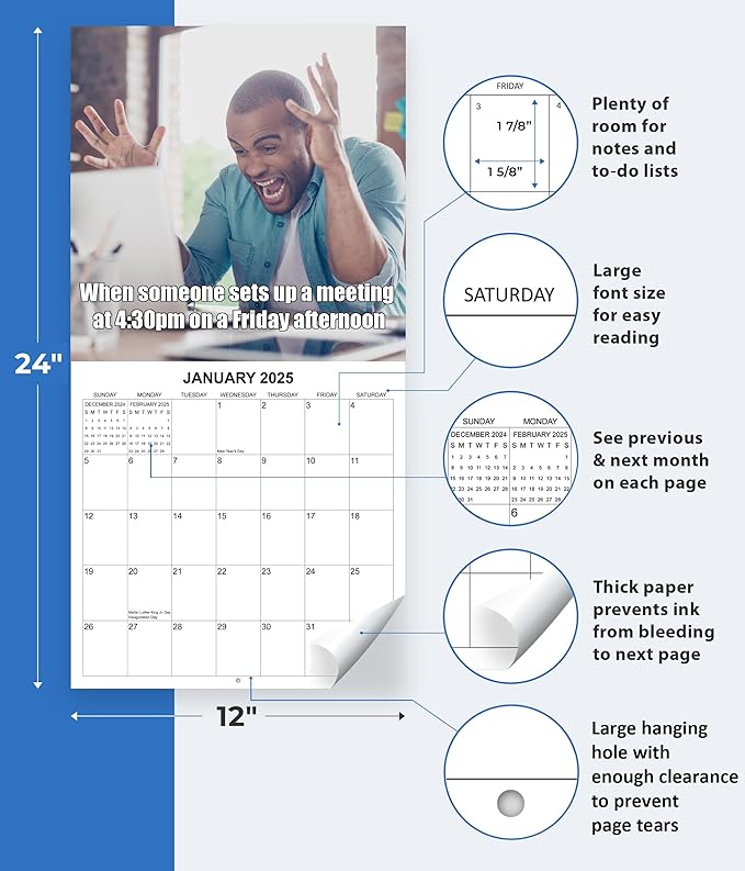 - STAY ORGANIZED IN STYLE: While the laughs wil come, we haven't forgotten about functionality. The large grid size for each day provides ample space for your important dates and notes, ensuring you stay organized all year round