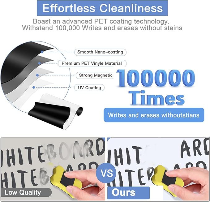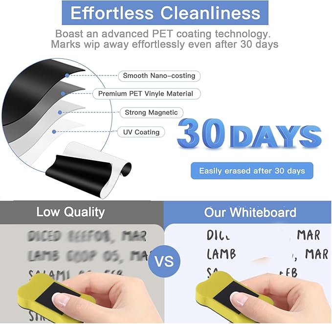 • Effortless Cleanliness --- Our magnetic whiteboard boasts an advanced PET coating technology for a smooth, easy-to-clean surface. The magnetic fridge board can withstands 100,000 writes and erases without stains. Even after 30 days, marks wipe away effortlessly. Enjoy clear, smudge-free writing and convenience every time! (Stubborn stains can be removed with a damp cloth. )