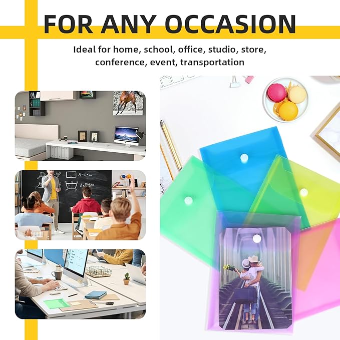 - for Any Occasion: You can use our plastic envelopes to store stamp and die, stickers, cash, photos, receipts, invoices, documents, notebooks, cards, letters, invitations, greeting cards, etc. Ideal for home, school, office, studio, store, conference, event, transportation