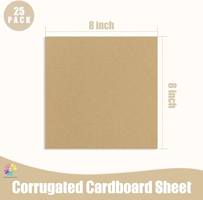 Mat Board Center, 25 Pack 8x8 Brown Cardboard sheet, 1/8 inch thick, Flat Corrugated Cardboard Inserts for Packing, Shipping, Mailing, Cardboard Backing, Art Craft Card Board