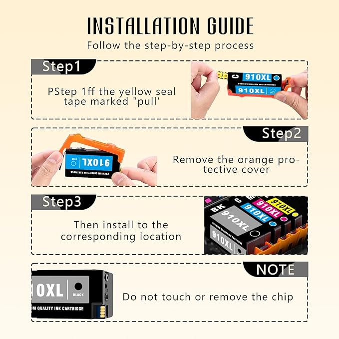 - --For HP 910 INK / hp 910xl ink cartridges combo pack--For hp ink 910xl fade resistant color: hp 910 910xl 910 xl ink cartridges are equipped with upgraded chips and high-quality ink to ensure fade-resistant color. We are committed to provide superior, brilliant and true-to-life images.