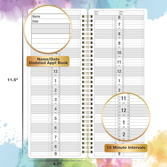 Appointment Book - Salon Appointment Book, 11.5" x 4.7", Hourly Planner, 2 Columns, Undated, 6 AM - 9 PM, Spiral Bound, 200 Pages, Colorful
