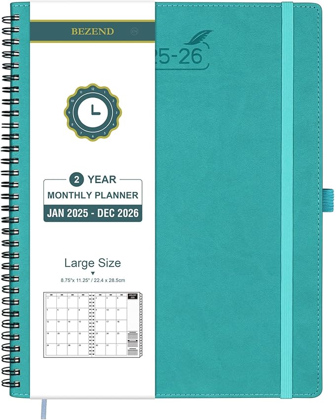 BEZEND Monthly Planner 2025-2026, Large size, 2 Year Monthly Calendar 8.5" x 11" - 120 GSM Thick Paper - Spiral Planner with Pockets, Tabs, Calendar with Note Sections, Pen Loop, Softcover - Turquoise