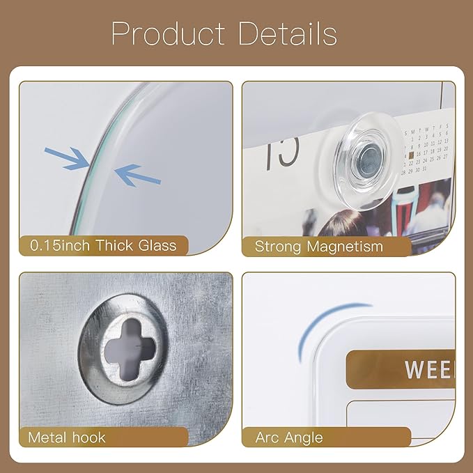 - 🧲TEMPERED GLASS & MAGNETIC: Made of 0.15inch Thick Tempered Glass, high strength and explosion-proof. The magnetic glass surface design allows you to hold some photos, papers, etc. and also use refrigerator magnets to decorate your glass board. We are equipped with 2 strong magnets.