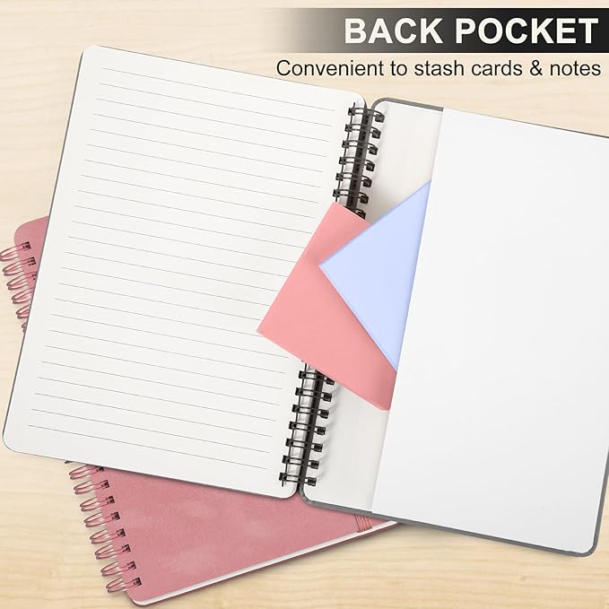 - Sturdy Spiral Twin-wire Binding & Inner Pocker: Feature a sturdy double spiral coil binding, the journaling notebooks are easy to flip the pages, flat and fold. Perforated inside pages allow to tear off unwanted pages. The back cover of the notebook journal includes an expandable pocket to store small objects. The elastic band on the outside of the lined notebook can also help you fix and mark pages perfectly. Perfect spiral bound journal notebooks for work, college supplies.