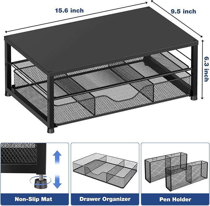 - Save Space:This 2-Tier monitor stand with drawer and 2 hanging pen holders provides ample storage space to keep your office supplies and office desk accessories neatly organized and easily accessible, keeping your workspace tidy and improving your sense of well-being