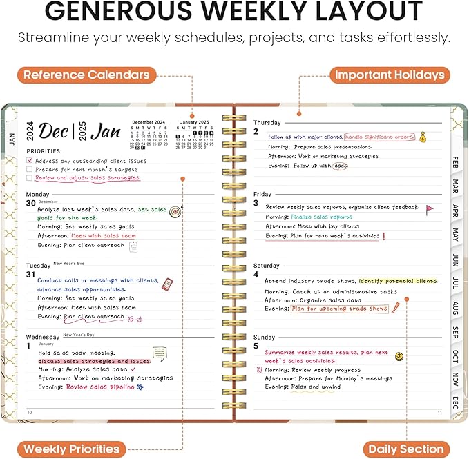 - Weekly Focus: Achieve your weekly goals with ease. The weekly pages provide generous space for appointments, events, and to-do lists, while checkboxes help you track and celebrate progress as you move through the week.