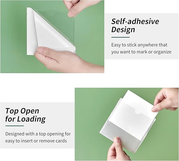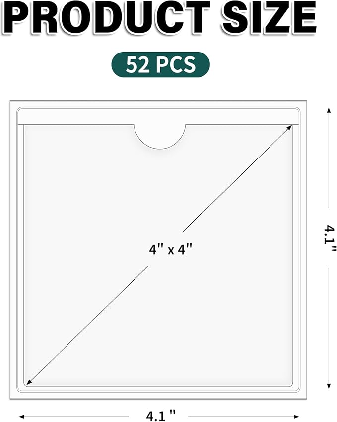 - Package Includes: 52 pack clear adhesive label pockets with top opening for easy to insert or remove index cards. Ideal size for 4 x 4 inch index cards