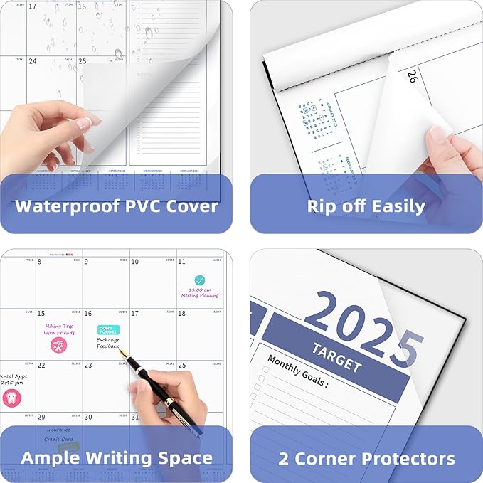 - 【Premium Thick Paper】With a weight of 0.264lb per sheet, the 2025 calendar is designed using premium thick paper, ensuring a high-quality writing experience. It is resistant to ink seepage, resulting in clean and crisp writing. To safeguard the calendar from dust and liquids, it comes with a transparent PVC cover. Two corner protectors are included to keep the pages flat. Plus, the cutting line allows for effortless tearing of each month's page. This desk calendar is perfect to long-term use.
