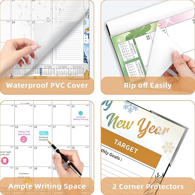 - 【Premium Thick Paper】With a weight of 0.264lb per sheet, the 2025 calendar is designed using premium thick paper, ensuring a high-quality writing experience. It is resistant to ink seepage, resulting in clean and crisp writing. To safeguard the calendar from dust and liquids, it comes with a transparent PVC cover. Two corner protectors are included to keep the pages flat. Plus, the cutting line allows for effortless tearing of each month's page. This desk calendar is perfect to long-term use.