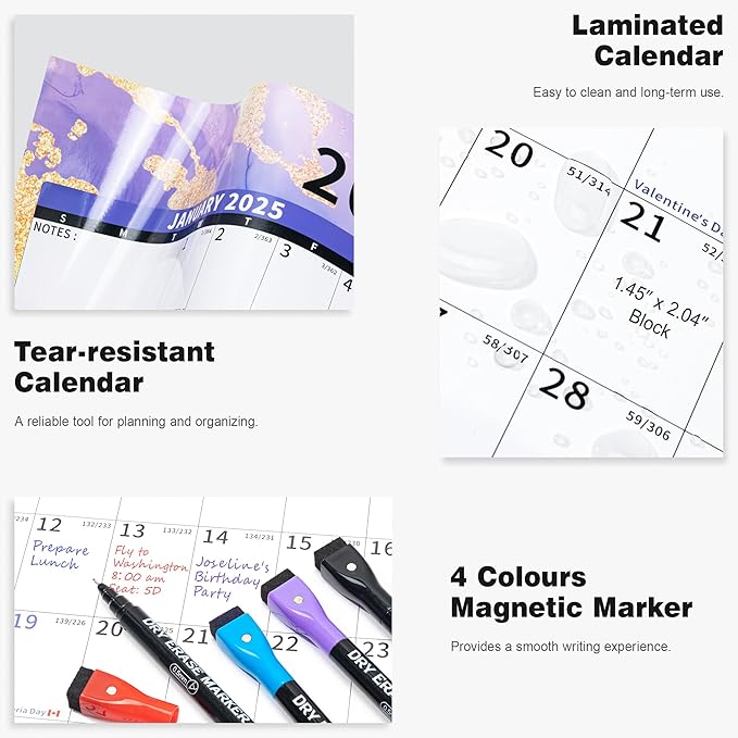 - ✨ Laminated Calendar with Dates: Waterproof wall calendar comes with a mini eraser, four dry-erase markers, 12 push pins, and 10 transparent round stickers. 2 yearly calendar planner covers the time range from Jan 2025 to Dec 2026, making it perfect for long-term use.