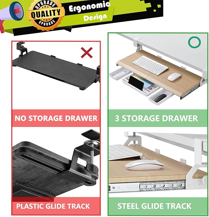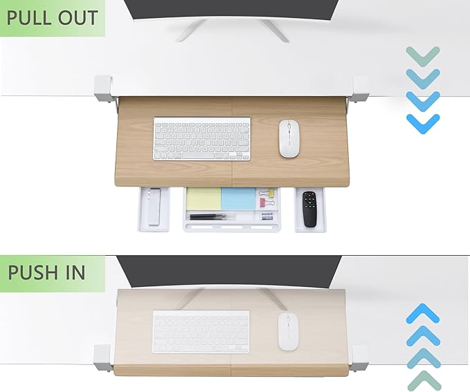 - Smooth Gliding Tracks - Retractable smooth sliding rail design allows the desk drawer to glide smoothly forward and backward. It encourages you to keep your arms and wrists in a neutral position and aids in the prevention of injuries caused by poor posture. Simply slide the tray under your desk when not in use and quickly pull it out when you need more space.