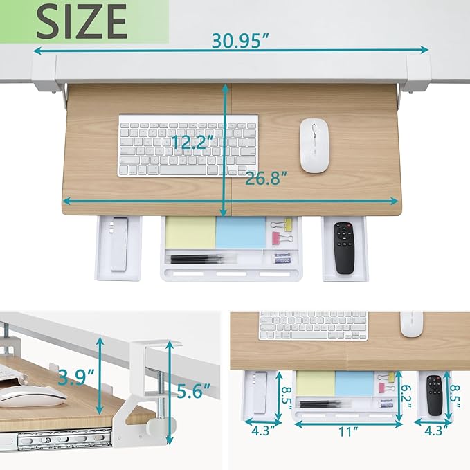 - Maximize Desk Space & 3 Drawers - The ETHU keyboard tray is designed to save desk space with its 26.77” (31.18" with clamps) x 12.2” size, allowing you to fit your keyboard, mouse, and small accessories beneath your desktop. Underneath the keyboard, 3 drawer storage adds valuable extra workspace for your phone and other items