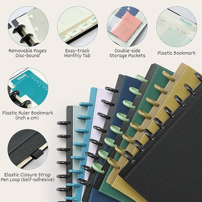 - 【PRACTICAL DESIGNS】Disc binding allows you to remove and rearrange the pages. With Elastic Closure Strap & Self-adhesive Pen Holder & Storage Pockets & Plastic Bookmark & Plastic Ruler Bookmark