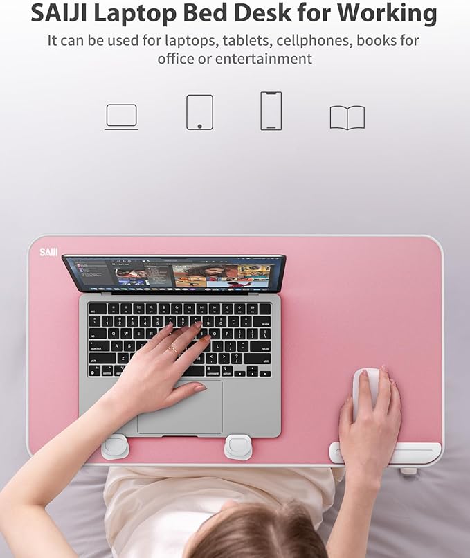 - Foldable and Portable Laptop Desk for Bed: SAIJI Laptop desk for bed can be folds flat for space-saving storage. It’s only 1.8 inches thick after folded, so it’s easy to carry and storage. Great for using at home, office or on the road.