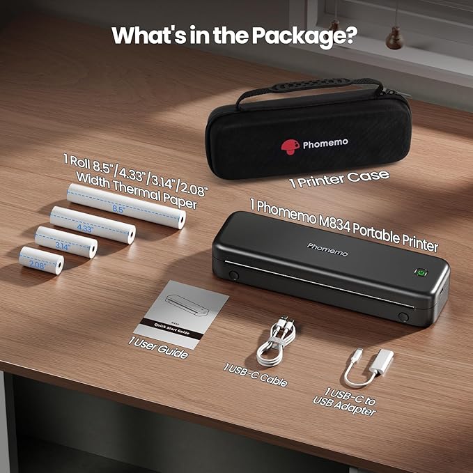 - What's is in Package: 1 M834 Portable Printer,1 Carry Case,1 Roll 8.5" Thermal Paper,1 Roll 4.33" Thermal Paper,1 Roll 3.14" Thermal Paper,1 Roll 2.08" Thermal Paper