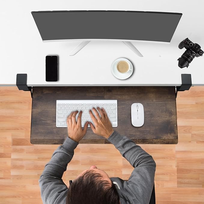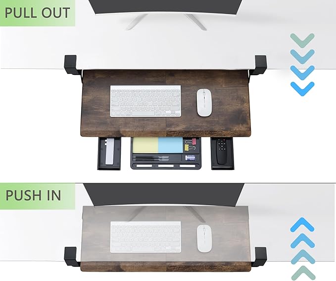 - Maximize Desk Space & 3 Drawers - The ETHU keyboard tray is designed to save desk space with its 26.77” (31.18" with clamps) x 12.2” size, allowing you to fit your keyboard, mouse, and small accessories beneath your desktop. Underneath the keyboard, 3 drawer storage adds valuable extra workspace for your phone and other items