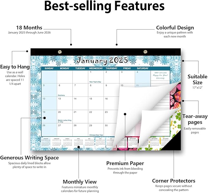 - 18-Month Planning at a Glance: This desk calendar 2025-2026 covers an extensive 18-month range from January 2025 to June 2026, making it the perfect tool for long-term planning. Whether you're organizing your home, school, or office, its spacious design and highlighted holidays allow for easy tracking of important dates, ensuring you stay ahead throughout the year