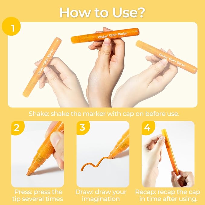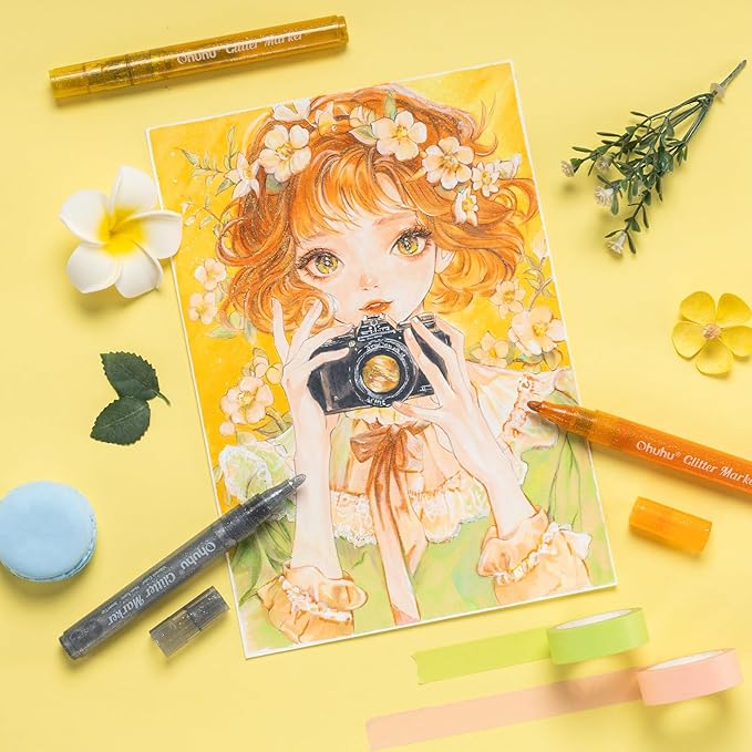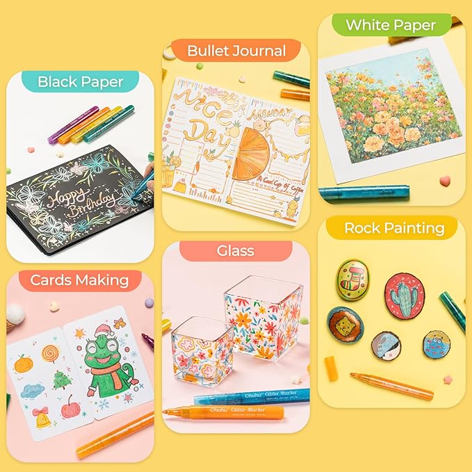 - VALUE USING: Ohuhu glitter metallic pens has a Sparkle and attractive writing effect, suitable for casual creation and play, and can also be embellished and modified on professional paintings; Moreover, these glitter pens are so fun to apply to a variety of painting interfaces, such as books, greeting cards, scrapbook journals, photo albums, glass, wood, stone, etc.