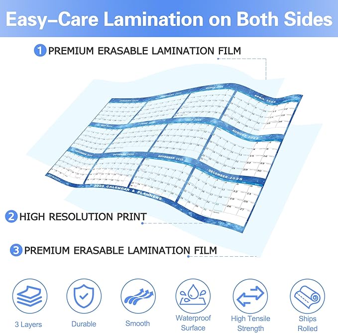 - Premium Laminated Paper - This large 2025 wall calendar is made of high double thick paper and a finishing coat to prevent ink through and avoids feathering with a stain-resistant surface. It’s easy to be wiped and clean with a touch of water without leaving any stain or ghosting.