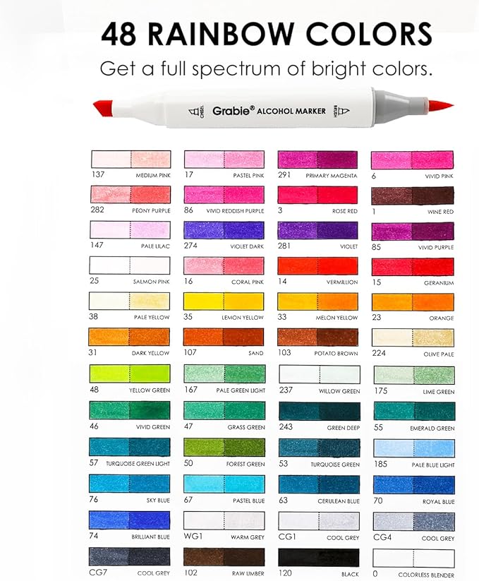 - MINDFUL COLORING BOOK INCLUDED - Indulge in the soothing and therapeutic experience of the Grabie 48 Alcohol Marker set, complete with a meticulously crafted coloring book aimed at promoting mindfulness and relaxation. The thick, premium pages are specially designed to handle alcohol-based ink without bleeding through, so you can focus on your art without worrying about damaging the next page.