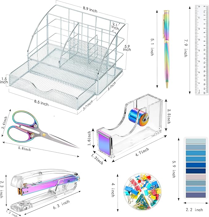 Dream Color Desk Accessories, Office Desk Organizers and Accessories Supplies with Mesh Desk Organizer, Tape Dispenser, Stapler, Staples, Ballpoint Pen, Clips Set, Ruler, Scissor, Sticky Tabs