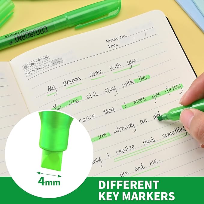 - CHISEL TIP DESIGN: The green highlighter features a versatile chisel tip that allows for both broad and fine lines, making it perfect for underlining text or highlighting important information.