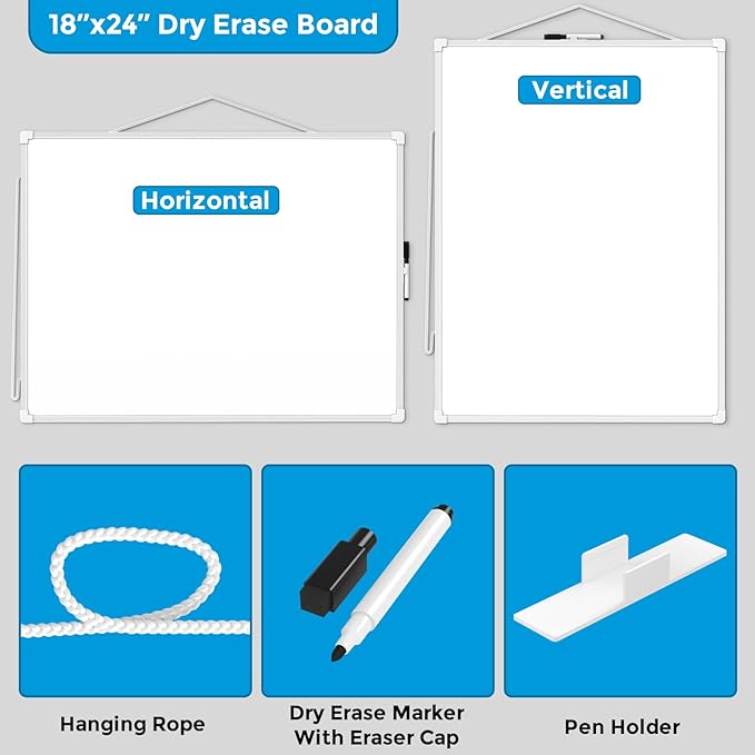 - PREMIUM & DURABLE: MaxGear 24" x 18" double sided Dry Erase Board is made of high-quality material, which is highly durable. Comes with a moveable pen holder and 2 lanyard on the sides, a Black Dry Erase Marker with a magnetic Cap built-in Eraser. This 24"x18" dry erase board for wall is portable and lightweight. It's easy to store and carry. A good choice for home, school, office, etc.
