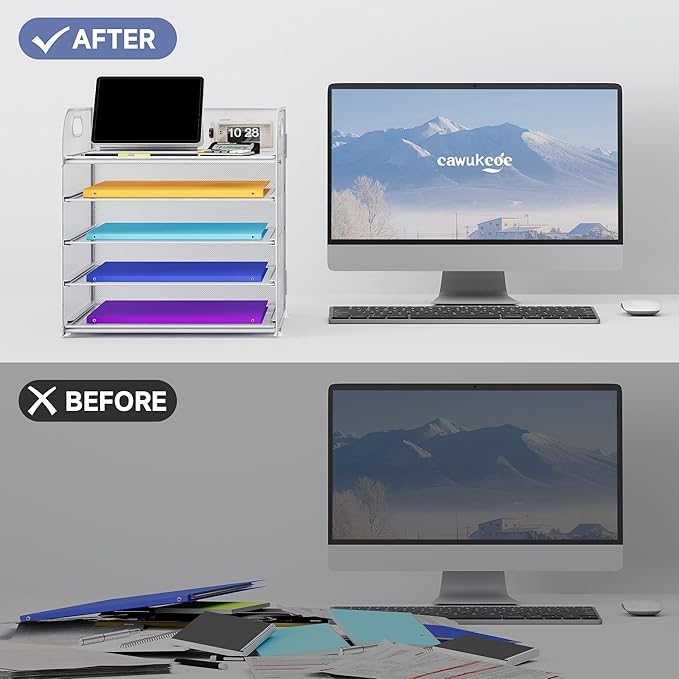 - 【EFFICIENT DESK ORGANIZER】Keep your desk tidy and clutter-free with our 5-Tier Paper Organizer with Handle. This file organizer provides ample space for sorting and storing papers, letters, documents, folders, books, magzines, staplers, caculators and sticky notes.