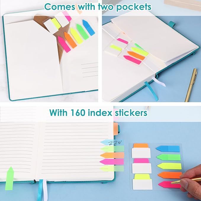 - Value of Money:This leather notebook with150sheets/300pages has 1 pen holder, 2 ribbon bookmarks, one paper pocket on the open cover, one expanding pocket on the back cover, and an extra 160 index stickers to meet your needs.