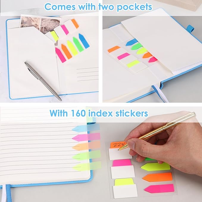 - Value of Money:This leather notebook with150sheets/300pages has 1 pen holder, 2 ribbon bookmarks, one paper pocket on the open cover, one expanding pocket on the back cover, and an extra 160 index stickers to meet your needs.