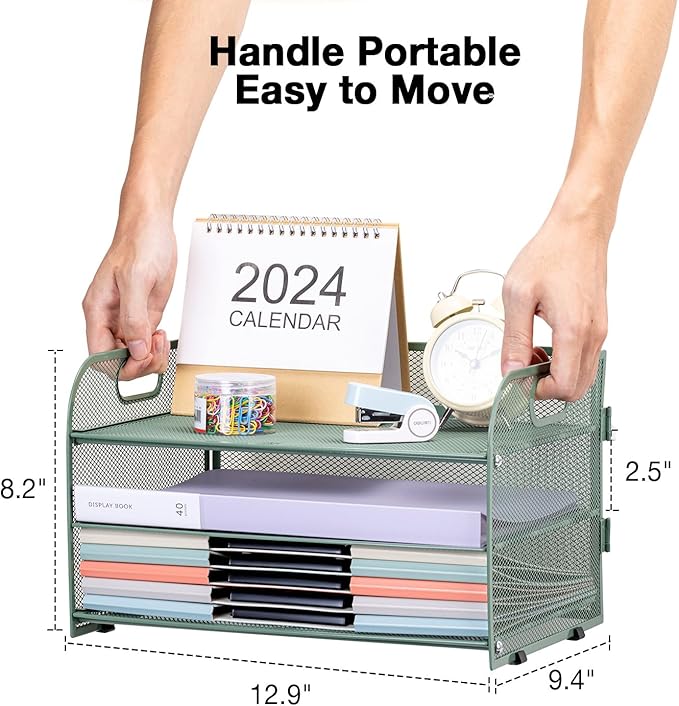 3-Tier Letter Tray Paper Organizer with Handle,Compact Mesh Desk File Organizer for Home Office Supplies Desktop Accessories,Green