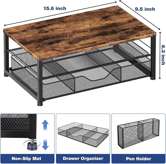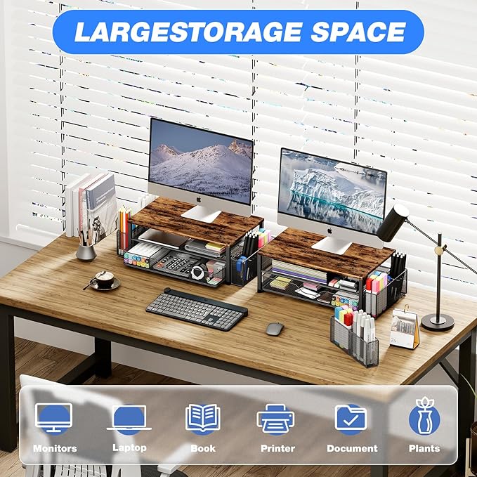 - Save Space:This 2-Tier monitor stand with drawer and 2 hanging pen holders provides ample storage space to keep your office supplies and office desk accessories neatly organized and easily accessible, keeping your workspace tidy and improving your sense of well-being