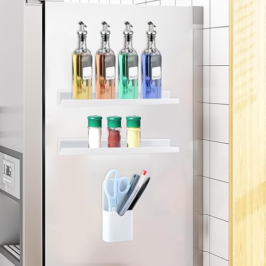 - 【PACKAGE CONTENT】You will receive 2pcs magnetic book shelf, 1pc pen holder and 2pcs adhesive hooks, 2 colors(white/black) for choose from, in the same usage scenario, the pen holder can be used to store pens, erasers and other small tools. Hooks can be used to hang small items such as keys, etc.