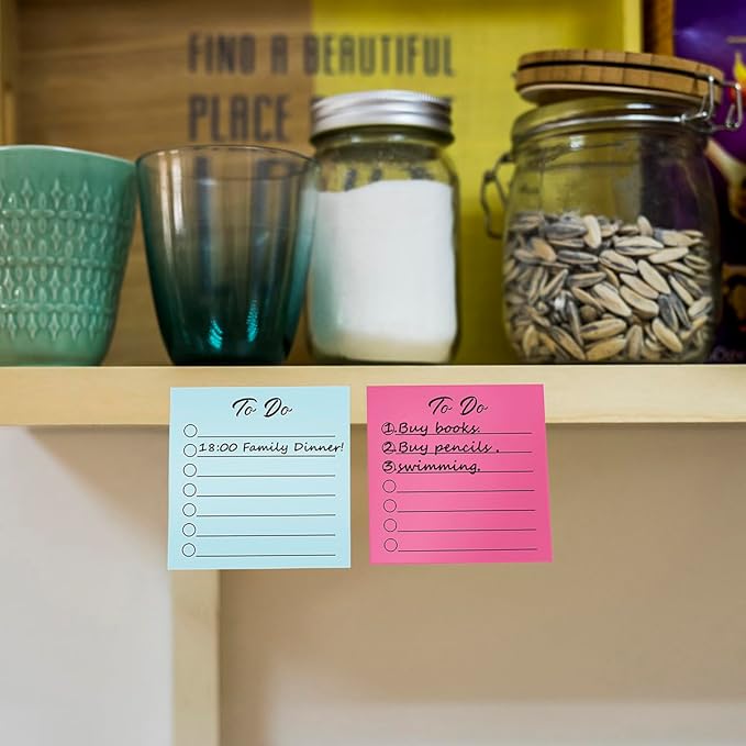 - 【Wide Use】: These sticky notes can be used to write notes, memos, plans, shopping lists, to-do lists, etc. to help remind you to do important or trivial things that are easy to forget; you can stick them to many items with smooth and clean surfaces, such as books, notebooks, computers, whiteboards, windows, walls, doors, refrigerators and so on.