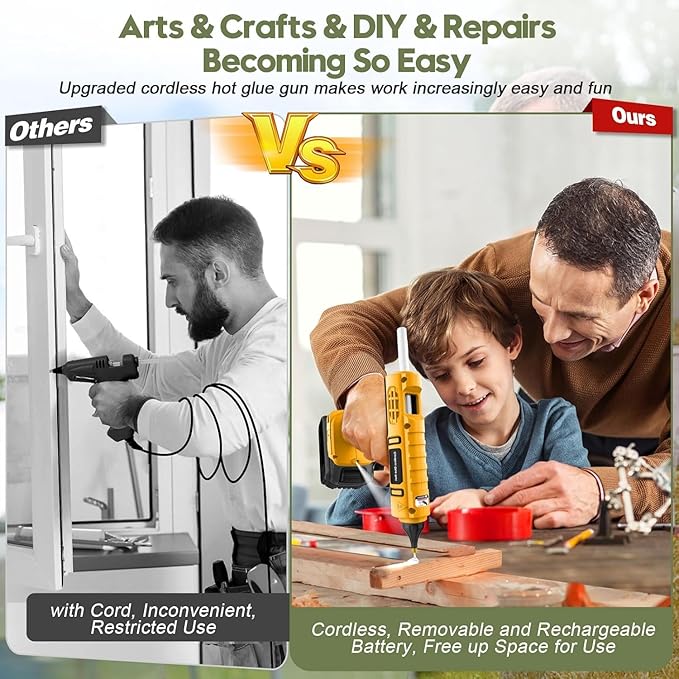 - The Hot Glue Gun for Crafts and Construction: A craft lover and DIY enthusiast cannot go very far without a cordless hot glue gun kit by his/her side. The hot glue gun has the characteristics of high temp, smoothly discharging of glue, large squeeze trigger, enhanced safety features, stand-in self, etc. We are confident that this hot glue gun cordless can meet your arts & crafts & DIY & heavy duty & construction needs.
