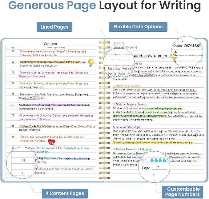 - Customizable Pages & Table of Contents: Includes 4 table of contents pages to keep your notes organized and easy to reference. Contains 50 sheets/100 lined pages that allow you to write on both sides, each page allows you to customize page numbers and dates, making it the ultimate notebook for you.