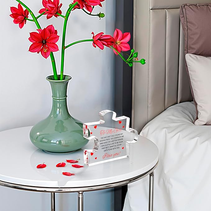 - Crafted To Last For A Lifetime: Just like your love. Made from clear, durable acrylic with charming red heart designs, this decorative block puzzle piece is not only eye-catching but also sturdy enough to stand the test of time.