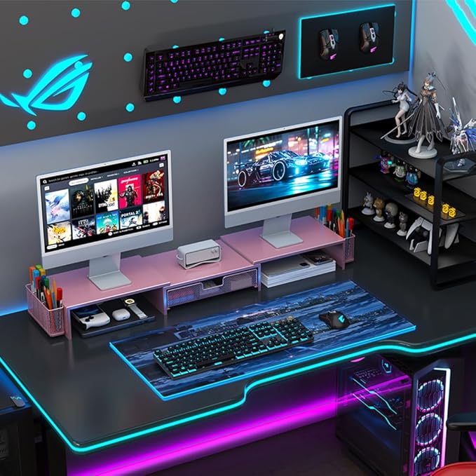 gianotter Dual Monitor Stand Riser, Desk Organizer With Drawer and 2 Pen Holders,Desk Organizers and Accessories, Pink Office Supplies (Pink)
