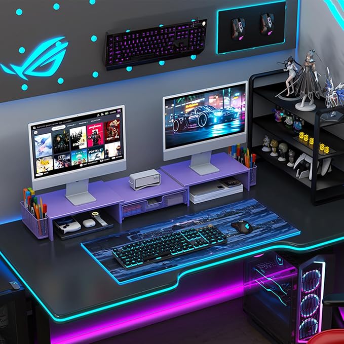 gianotter Dual Monitor Stand Riser, Desk Organizer With Drawer and 2 Pen Holders, Desk Organizers and Accessories, Purple Office Decor (Purple)