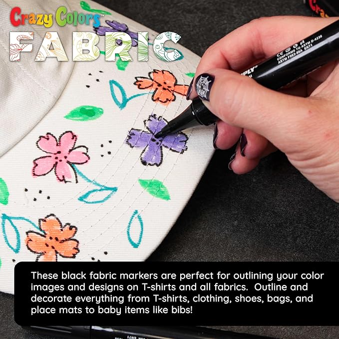 - Long-Lasting Black Ink: 6 deep black Crazy Colors fabric markers that dry permanently and have rich, vibrant pigments for intense colors on all fabrics. Our deep black ink stays vibrant and sharp, even after countless washes. The ideal clothing design markers. These black fabric markers are perfect for outlining your color images and designs on T-shirts and all fabrics.