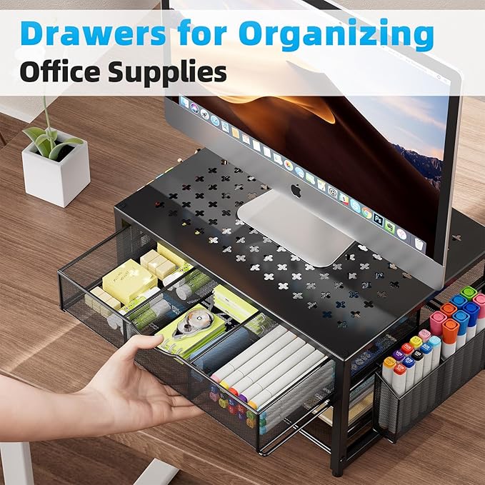 - 【Upgrade Printer Stand】This desk stand features a metal frame, 1 drawer organizer,1 paper letter tray, and 2 hanging pen holders making the stand an ideal choice for managing a desktop. Multifunction helps you not only save printer space but also manage the desk gadgets and stationery clean and tidy.