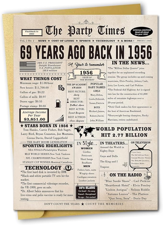 - This large 69th birthday card features a vintage newspaper design, showcasing important events, movies and sports events from 69 years ago.
