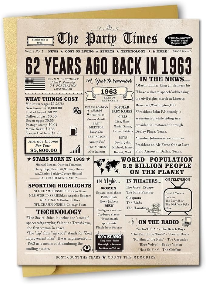 - This large 62nd birthday card features a vintage newspaper design, showcasing important events, movies and sports events from 62 years ago.