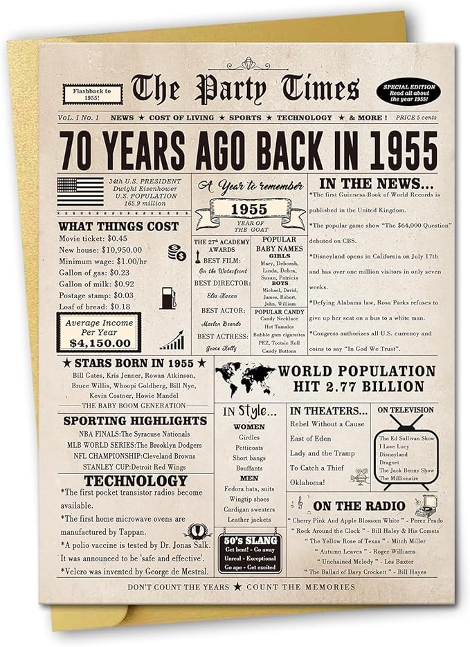 - This large 70th birthday card features a vintage newspaper design, showcasing important events, movies and sports events from 70 years ago.