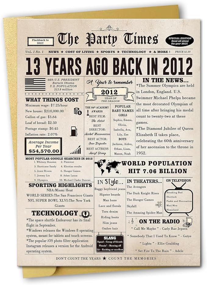 - This large 13th birthday card features a vintage newspaper design, showcasing important events, movies and sports events from 13 years ago.
