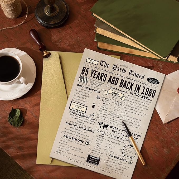 - This large 65th birthday card features a vintage newspaper design, showcasing important events, movies and sports events from 65 years ago.