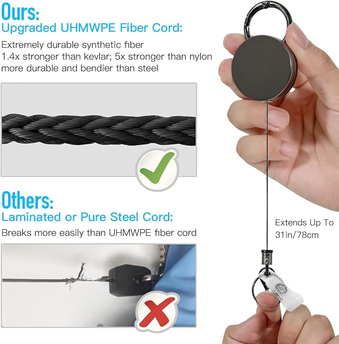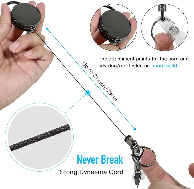 - UNBREAKABLE ROPE: 31 inches of ultra-high molecular weight polyethylene fiber rope makes our retractable badge reels more flexible and stronger than steel wire. Unlocking has never been easier